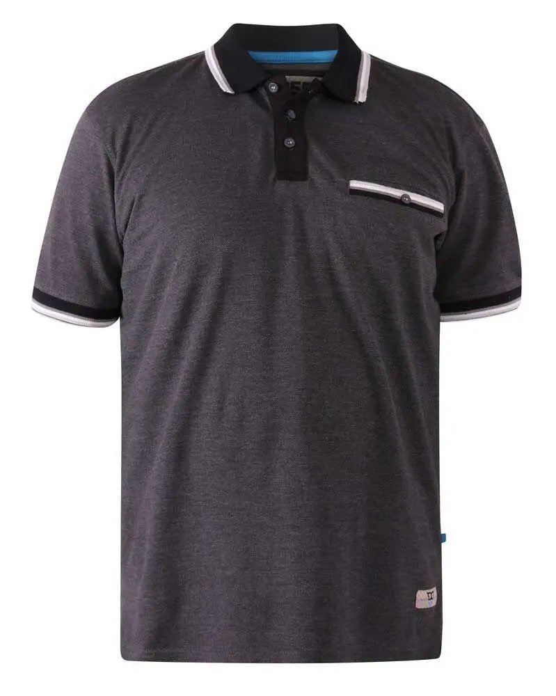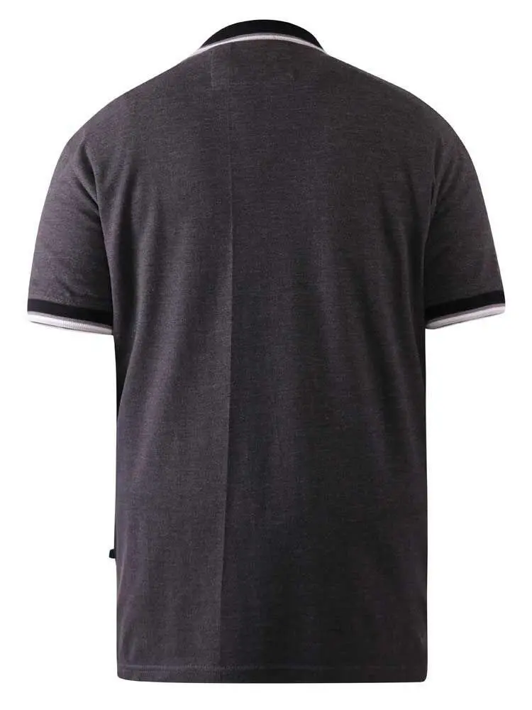 Koksgrå pique polo med med sort krave og stolpelukning samt kontraststriber på kraven og ærmerne fra D555. Polo-shirten er med ekstra længde til den høje mand.