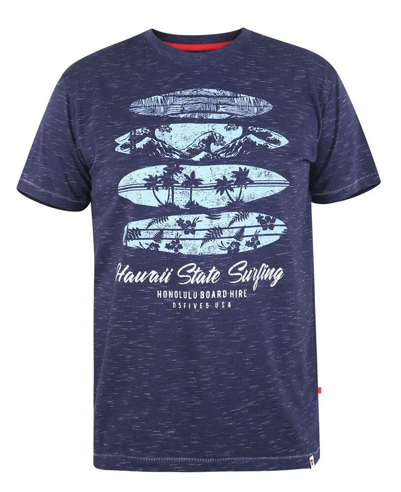 Navyblå blød T-shirt med print fra D555 til den høje mand. Printet forestiller 4 surfboards med forskellige motiver og nedenfor er teksten " Hawaii State Surfing" printet i hvid.
