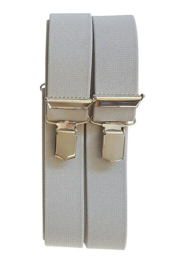 Ljusgrå breda hängslen. Hängslena är 3,3 cm breda. Hängslena har kraftiga klämmor som "biter" sig fast och håller dina byxor på plats.