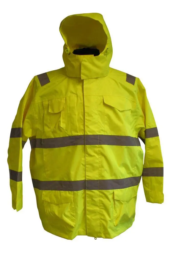 Arbetsregnjackan är gul och har reflexer. Jackan har avtagbar huva. Huven kan stängas tätt med dragsko och det finns extra stängning vid halsen som stängs med velcro.