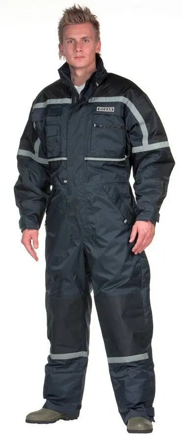 Kolgrå termokedeldräkt är en tvåfärgad overall med avtagbar komfortluva. Den har en tvåvägsdragkedja och en överlappande klaff med velcro framtill. Midjelång tvåvägsdragkedja längs sidosömmarna på benen.