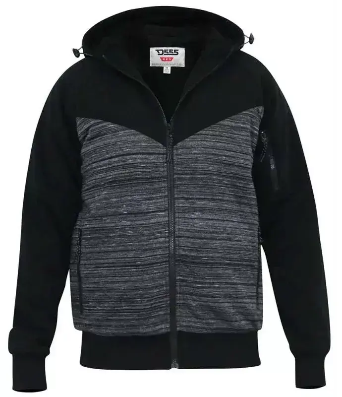 Det finns en bred ribbkant i svart i nederkanten av sweatjackan samt vid ärmarna. Det finns en svart påsydd D555-tag på ärmfickan, samt en tygetikett med D555-logotyp längst ner på framsidan.