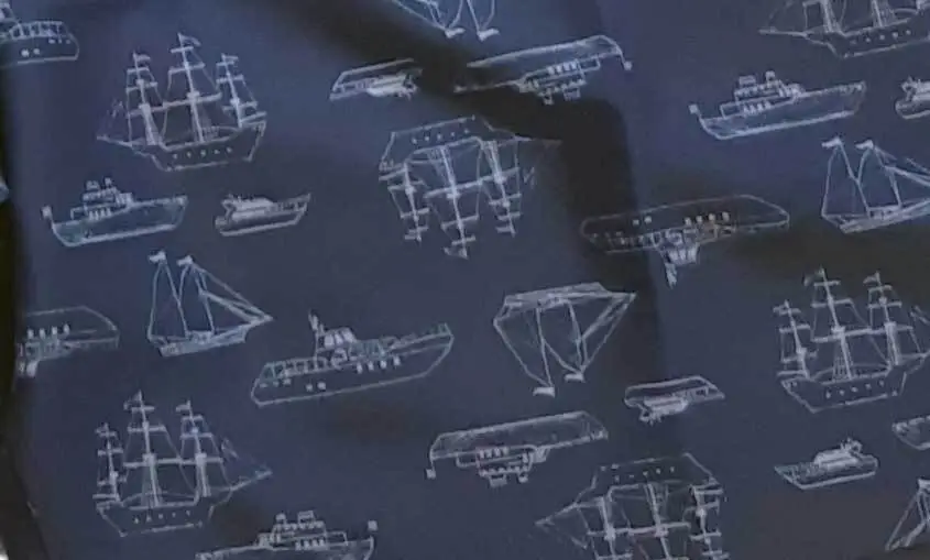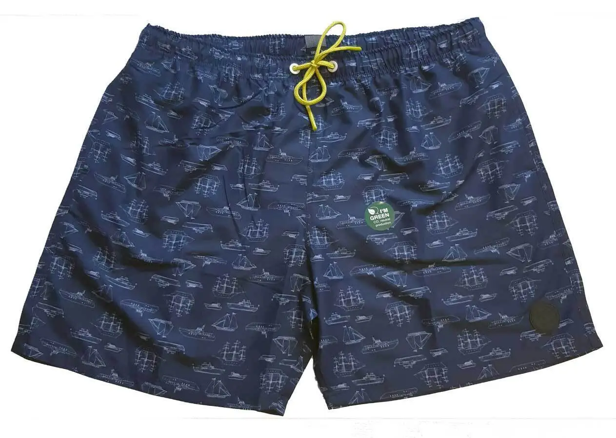 Marinblå badshorts från Ceceba. Badshortsen har tryck av olika skepp. Det finns två framfickor och en bakficka med kardborreknäppning.