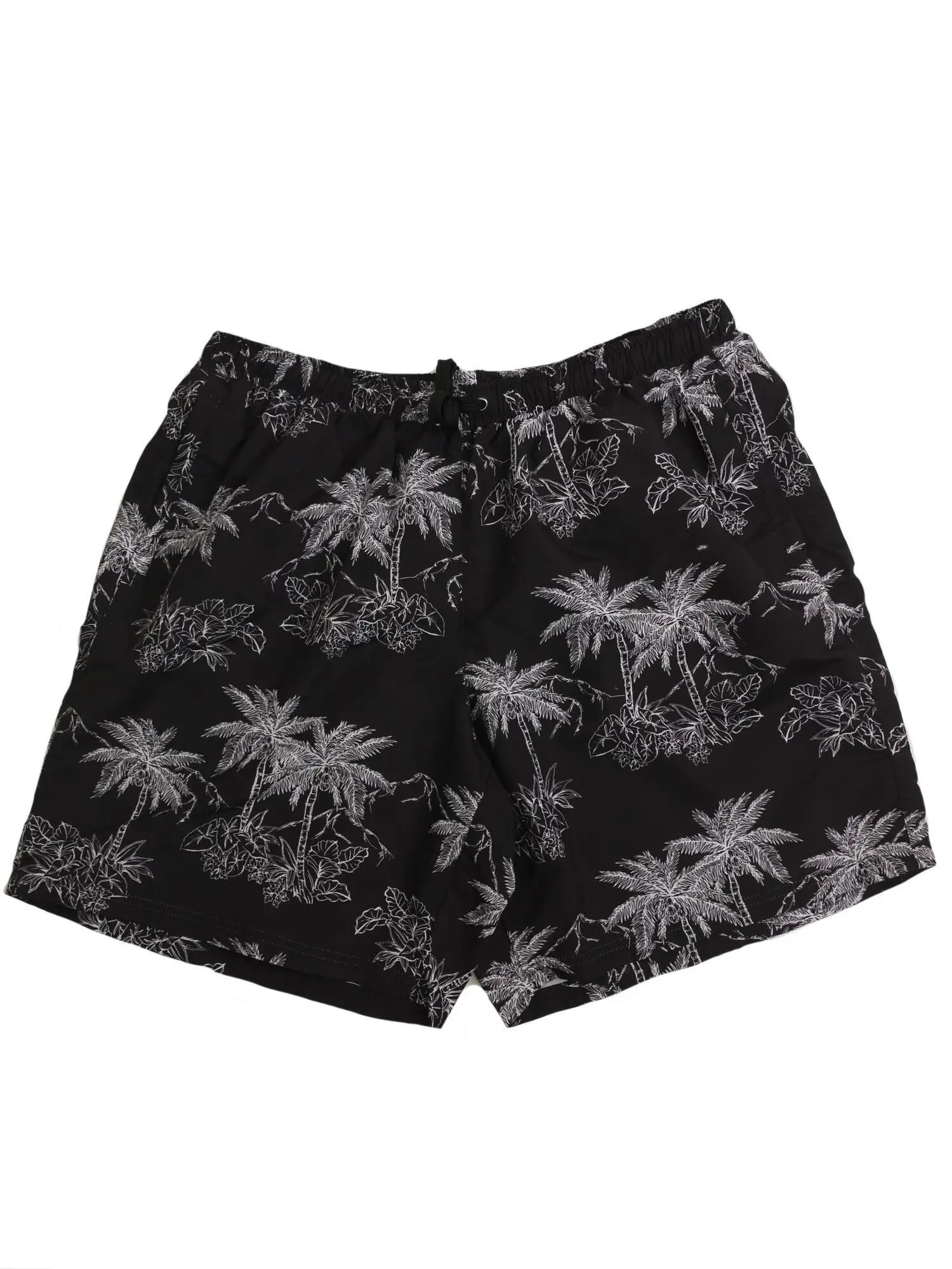 Svarta badshorts från Abraxas. Shortsen har ett vitt tryck med palmer och blad. Det finns två sidofickor fram, varav den ena kan stängas med dragkedja — praktiskt så att du slipper oroa dig för att tappa saker när du går på stranden eller vid poolen. Dessutom finns en bakficka som stängs med kardborreband.