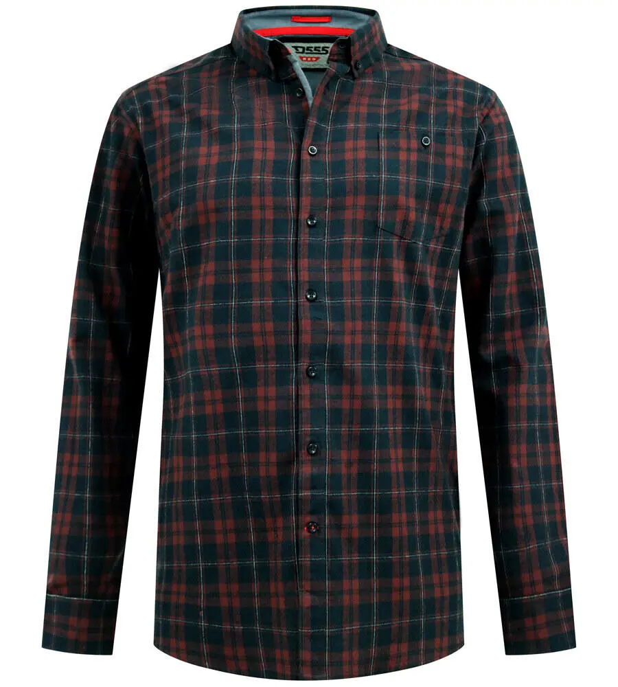 Rutig skjorta från D555 i bordeaux och svart med fina ljusa ränder. Skjortan har långa ärmar, knäppning, button-down-krage och en enkel bröstficka. Designen är klassisk och avslappnad och passar bra både i vardagen och vid informella tillfällen när du vill vara välklädd utan att det blir för formellt.