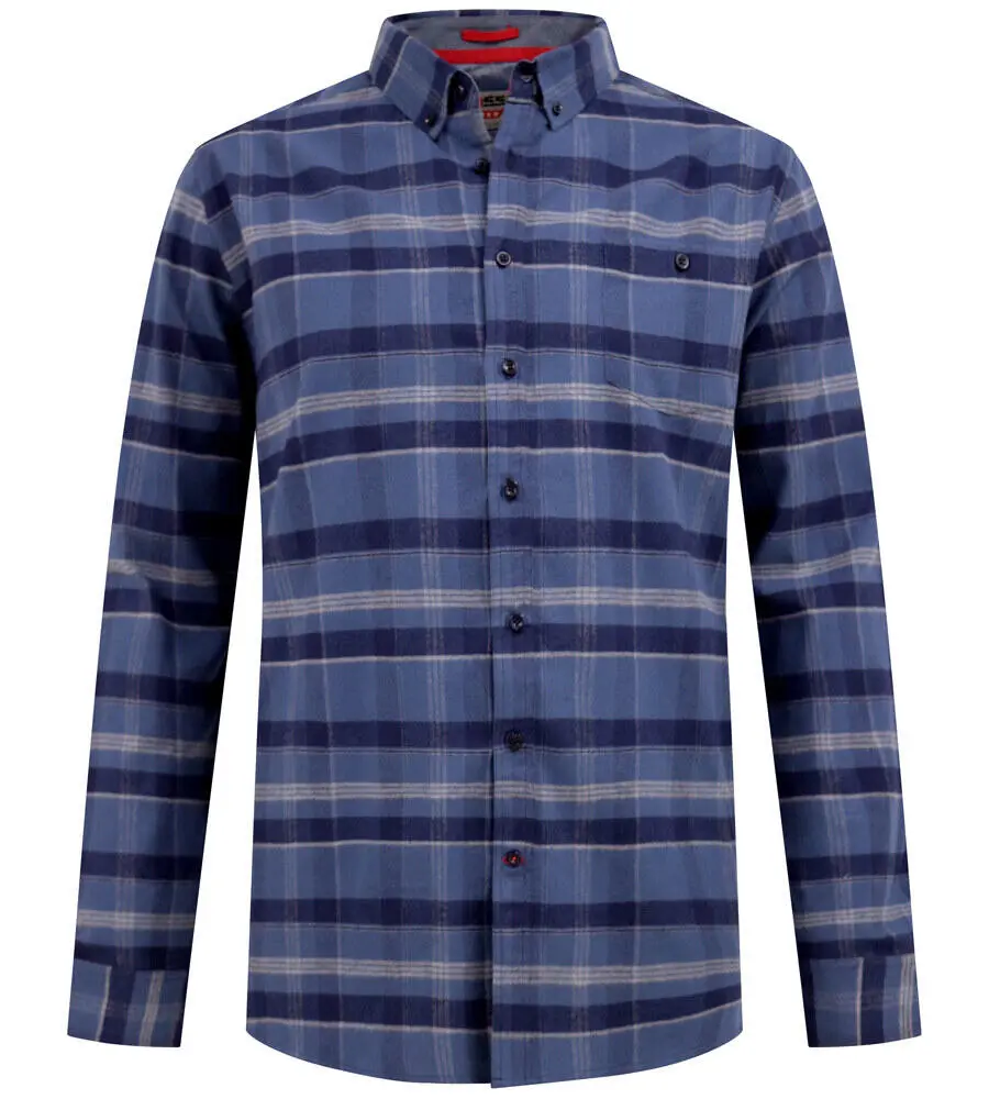 Långärmad skjorta från D555 i blå rutor med en skogshuggarinspirerad look. Skjortan har button-down-krage, bröstficka och klassisk knappslå. Färgerna är i ljusblå och mörkblå nyanser, vilket ger ett lugnt och tidlöst uttryck. Den passar perfekt för vardagsbruk, avslappnade dagar och som ett informellt alternativ till mer formella skjortor.