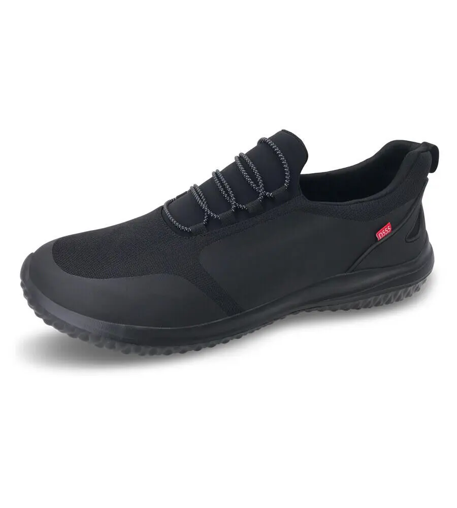 De här svarta sneakers från D555 är designade som handsfree-skor – skor som är lätta att ta av och på utan krångel. De elastiska snörena och den stadiga hälkappan gör att du enkelt kan glida i skon, och skon sitter bekvämt och säkert.