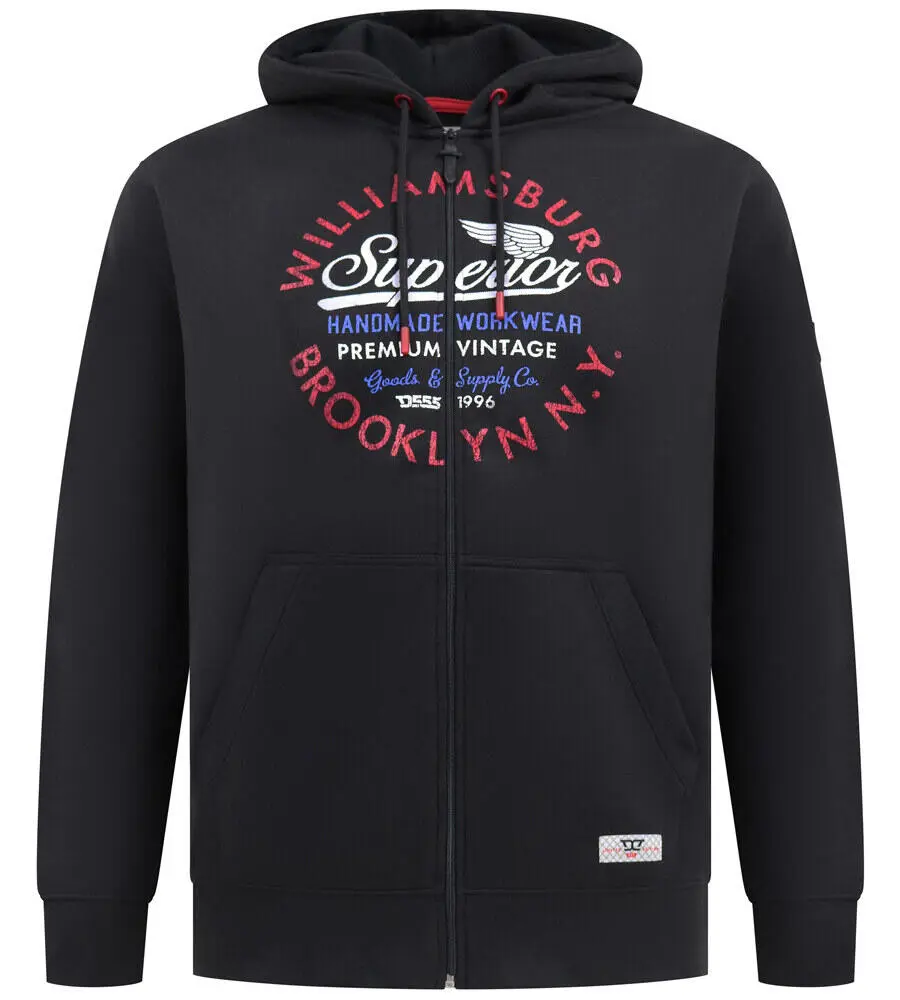 På bröstet hittar du ett stort tryck i rött, vitt och blått med texten “Williamsburg Superior Brooklyn N.Y.”, som ger hoodtröjan ett sportigt och urbant uttryck. Ribbstickade kanter vid ärmar och fåll säkerställer en bra passform, medan de genomtänkta detaljerna fulländar designen.
