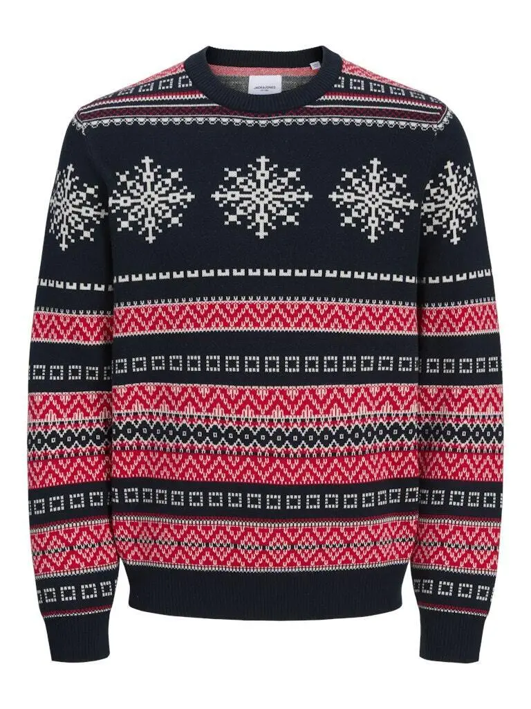Jack & Jones jultröja i ett klassiskt mönster med snöflingor och röda jacquardränder – perfekt för decembermys. Tröjan har rund hals, ribbad kant och en bekväm passform som gör den perfekt både till julfester och avslappnade dagar. Det stickade materialet känns mjukt och varmt utan att vara tungt – ett självklart val till den roliga och stilfulla julgarderoben.