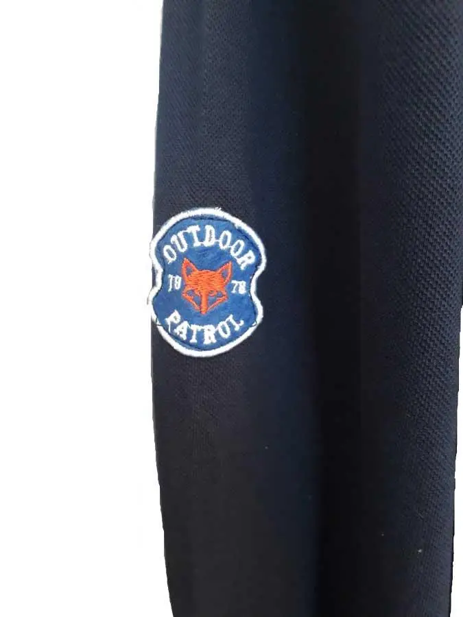 Bröstfickan som sitter på vänster sida stängs med knapp. Ovanför bröstfickan sitter en rund badge. På högra sidan sitter också två badges. Det finns dessutom en badge på varje ärm.