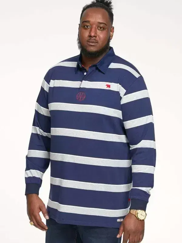 Långärmad marinblå polo med breda grå ränder och en liten tunn vit rand upptill. Polon är rugbyinspirerad och ger ett klassiskt men avslappnat uttryck.