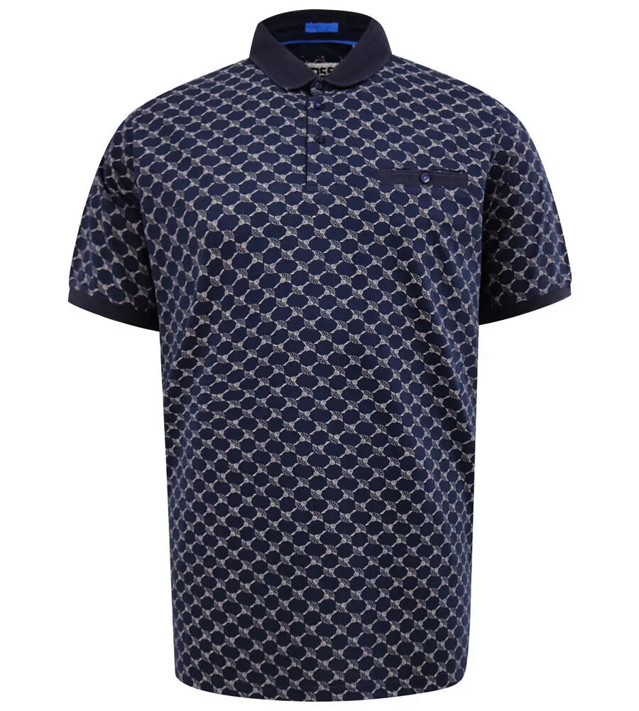 Mörkblå polo från D555 med ett genomgående mönster som ger ett stilrent och något mer exklusivt uttryck. Den klassiska polokragen och knappslutningen vid halsen skapar ett snyggt intryck som lätt kan användas både i vardagen och vid lite mer uppklädda tillfällen.