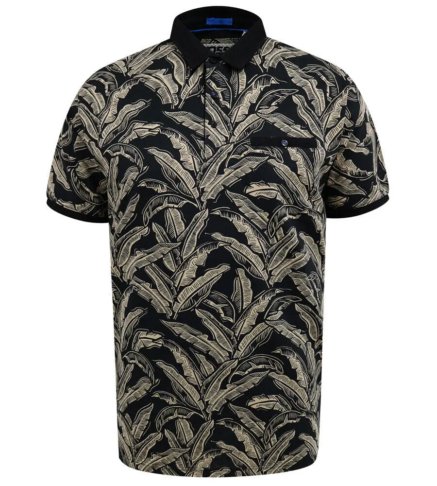 Svart piké från D555 med ett markant bladmönster i ljusa nyanser som ger ett modernt och iögonfallande uttryck. Det grafiska mönstret ger pikén karaktär samtidigt som den fortfarande framstår stilren och användbar.