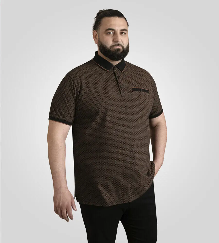 Svart piké från D555 med diskret all-over-mönster i kontrastfärg. Modellen har svart krage och ärmkanter med en tunn dekorlist som ger ett skarpt och balanserat uttryck. Bröstfickan har en liten knapp och matchar kragen och ärmarna i färg och stil. Tyget är mjukt och elastiskt, vilket ger god komfort och en bekväm passform för vardagsbruk.