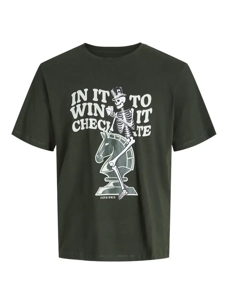 T-shirt från Jack & Jones i en djup mörkgrön nyans med ett stort tryck på framsidan. Motivet föreställer ett skelett i hög hatt, som sitter självsäkert på en schackpjäs och håller en kortlek i handen. Ovanför står texten In It To Win It – Checkmate, som understryker den självsäkra attityden. T-shirten är gjord i en mjuk bomullskvalitet, har rund hals och korta ärmar. Passformen är klassisk och bekväm – perfekt för vardagsbruk eller när du vill ge din outfit lite attityd.