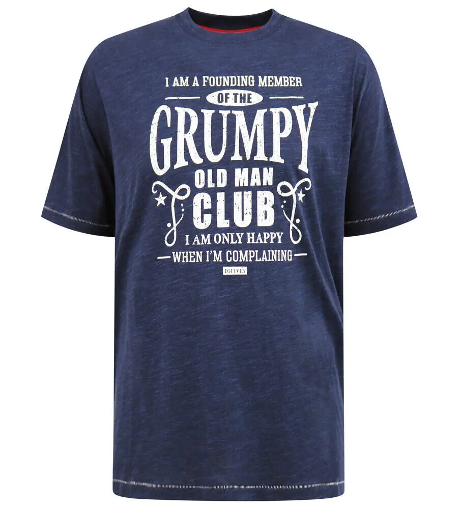 Blåmelerad T-shirt från D555 med ett humoristiskt och iögonfallande tryck med texten “Grumpy Old Man Club”. Det grafiska motivet ger ett avslappnat och självironiskt uttryck som sticker ut och tillför personlighet till din outfit.