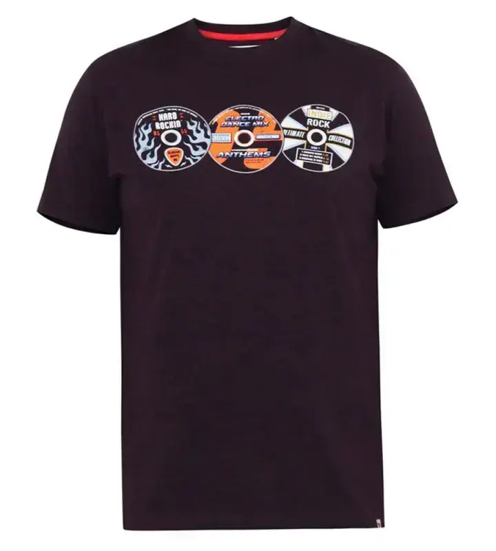 En snygg plommonfärgad T-shirt som är prydd med tre grafiska tryck på bröstet som liknar CD-skivor med olika mönster och text. Trycket ger ett retro och musikaliskt uttryck.