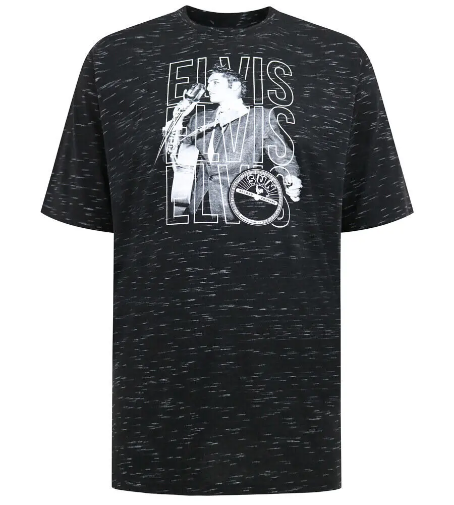 Svart T-shirt från D555 med vit melerad effekt och fronttryck av Elvis Presley. Motivet visar Elvis med mikrofon och gitarr, kombinerat med texten “ELVIS” i lager och den ikoniska Sun Records-logotypen. T-shirten har rund hals och en klassisk, avslappnad passform. Tillverkad i en mjuk bomullsblandning, lämplig för vardagsbruk och för dig som uppskattar musikaliskt nostalgi.