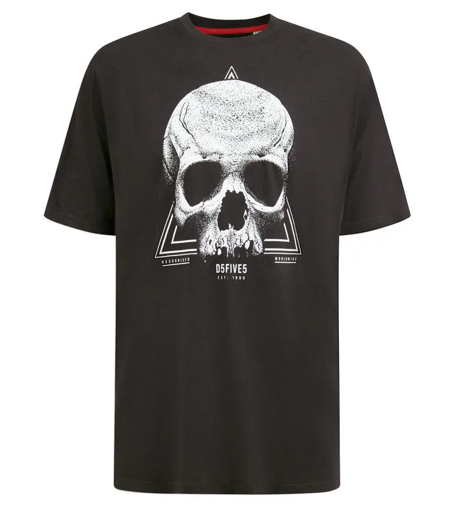 På bröstet syns ett stort vitt tryck av en realistisk skalleillustration, placerad framför en triangelgrafik för extra djup och kontrast. Under motivet står varumärket D5FIVE5 med texten "Recognised Worldwide – Est. 1996", vilket fulländar det grafiska uttrycket. En rå och stilren T-shirt med kant som enkelt kan stylas både till vardag och kväll.