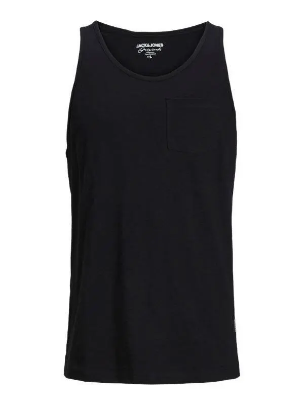 Svart lätt tanktop med en bröstficka. Toppen är i ett lätt och luftigt material, tyget har en svagt randig struktur.