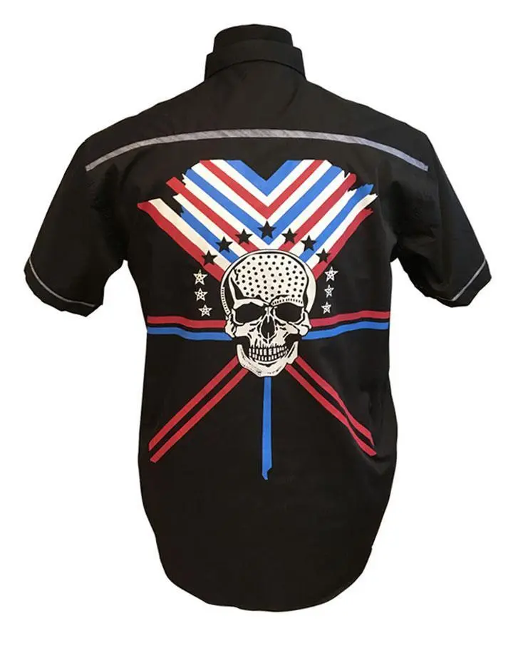 På ryggen är ett stort tryckt motiv av ett vitt kranium. Runt huvudet finns ränder i rött, vitt och blått samt svarta och vita stjärnor.